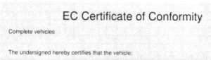 COC ist ein Dokument, mit dem der Hersteller bescheinigt, dass das konkrete Fahrzeug im Einklang mit den im Zeitpunkt der Fahrzeugherstellung gültigen Rechtsvorschriften der EU hergestellt wurde. Gleichzeitig bestätigt das COC Dokument die Herstellung des Fahrzeugs in der Übereinstimmung mit den technischen Spezifikationen genehmigt für den betreffenden Typ.
